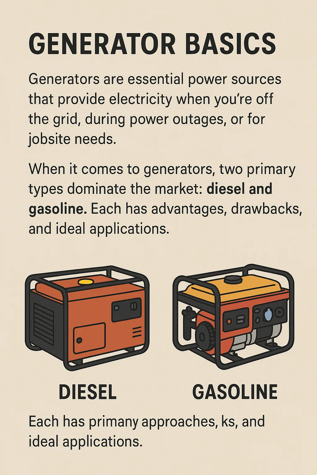 Dízel generátorok : Ezek jobban megfelelnek a nagyobb, folyamatos energiaigényeknek, mint például a nagy gépek, nagy teherbírású szerszámok működtetése vagy a vállalkozások és a kritikus infrastruktúra tartalék áramellátása.